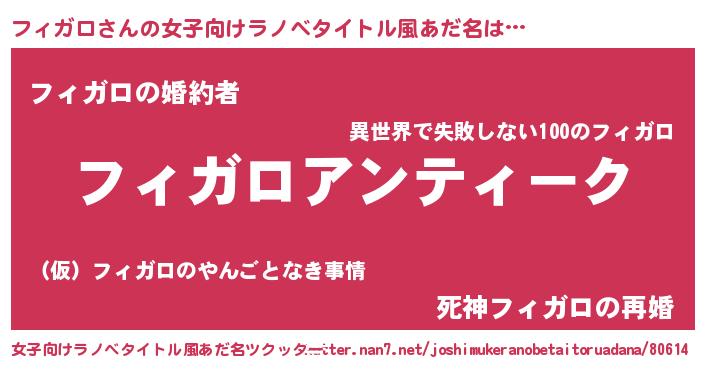 フィガロさんの女子向けラノベタイトル風あだ名は… 『フィガロアンティーク』『フィガロの婚約者』『死神フィガロの再婚』 ツクッター #女子向けラノベタイトル風あだ名ツクッター http://tkutter.nan7.net/joshimukeranobetaitoruadana/80614/