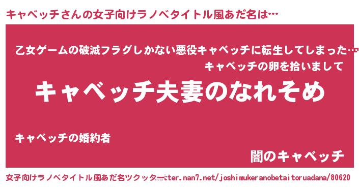 | 男性向けラノベタイトル風あだ名 | 『おまえをオタクにしてやるから、俺をキャベッチにしてくれ! 』 |