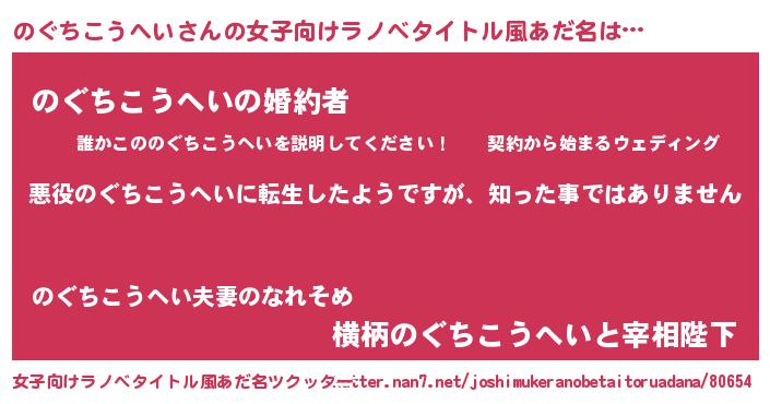| 男性向けラノベタイトル風あだ名 | 『この素晴らしい世界にのぐちこうへいを!』 |
