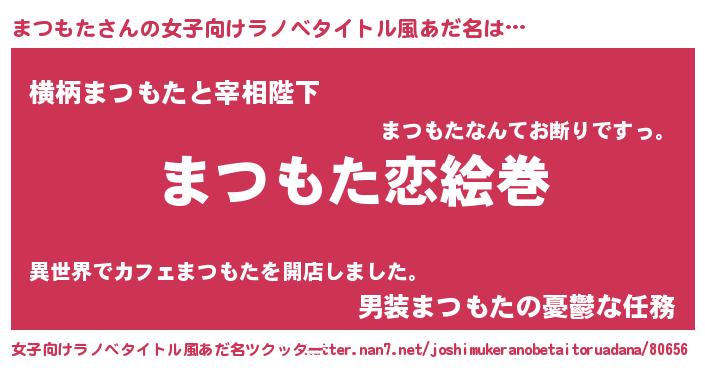 | 男性向けラノベタイトル風あだ名 | 『おまえをオタクにしてやるから、俺をまつもたにしてくれ! 』 |