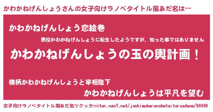 | 男性向けラノベタイトル風あだ名 | 『かわかねげんしょう~年齢イコール彼女いない歴の魔法使い~』 |