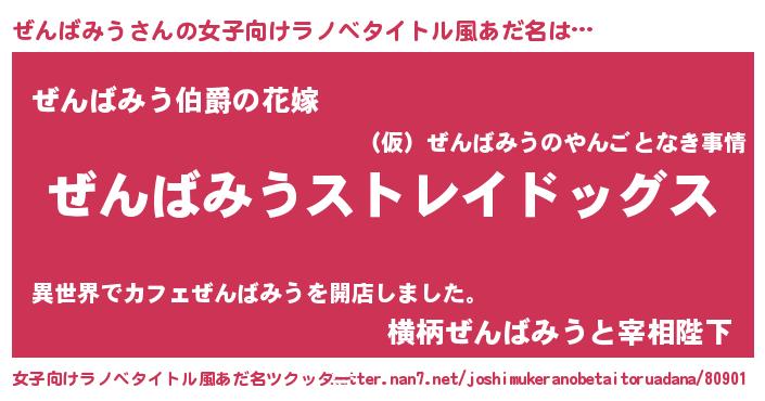 | 男性向けラノベタイトル風あだ名 | 『Re:ぜんばみうから始める異世界生活』 |