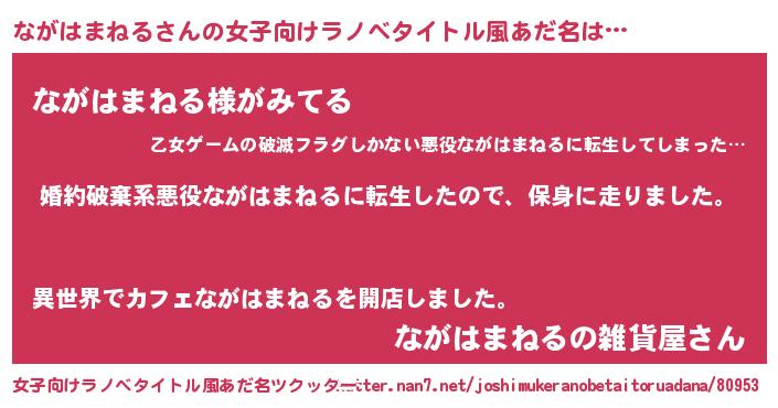 ながはまねるさんの女子向けラノベタイトル風あだ名は… 『婚約破棄系悪役ながはまねるに転生したので、保身に走りました。』『ながはまねる様がみてる』『ながはまねるの雑貨屋さん』 ツクッター #女子向けラノベタイトル風あだ名ツクッター http://tkutter.nan7.net/joshimukeranobetaitoruadana/80953/