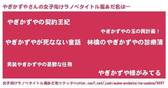 | 男性向けラノベタイトル風あだ名 | 『魔弾の王とやぎかずや』 |