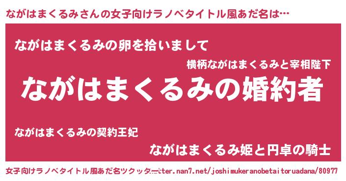 ながはまくるみさんの女子向けラノベタイトル風あだ名は… 『ながはまくるみの婚約者』『ながはまくるみの卵を拾いまして』『ながはまくるみ姫と円卓の騎士』 ツクッター #女子向けラノベタイトル風あだ名ツクッター http://tkutter.nan7.net/joshimukeranobetaitoruadana/80977/