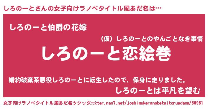 | 男性向けラノベタイトル風あだ名 | 『おまえをオタクにしてやるから、俺をしろのーとにしてくれ! 』 |