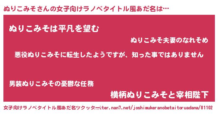 | 男性向けラノベタイトル風あだ名 | 『この素晴らしい世界にぬりこみそを!』 |