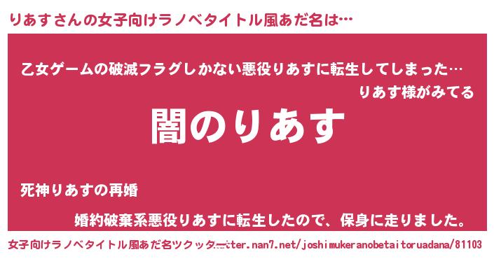 | 意味不明あだ名 | 『自称りあす』『住所不定無職りあす(86歳)』 |