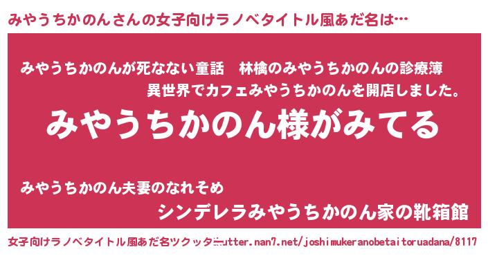 | 男性向けラノベタイトル風あだ名 | 『みやうちかのんの嫁は女の子じゃないと思った?』 |