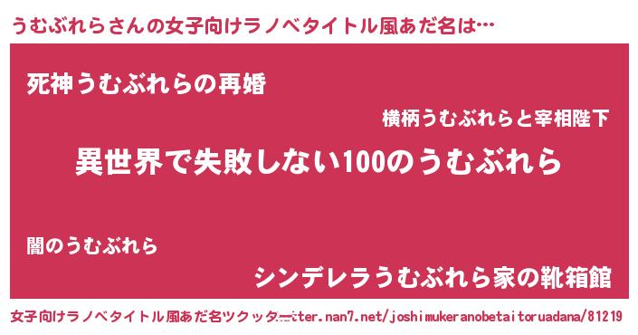 | 男性向けラノベタイトル風あだ名 | 『うむぶれらという概念が存在しない退屈な世界 』 |