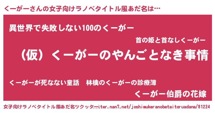 | 男性向けラノベタイトル風あだ名 | 『くーがーの憂鬱』『魔弾の王とくーがー』 |