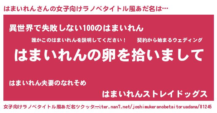 | 男性向けラノベタイトル風あだ名 | 『はまいれんの嫁は女の子じゃないと思った?』 |