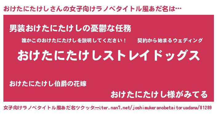 | 男性向けラノベタイトル風あだ名 | 『Re:おけたにたけしから始める異世界生活』 |