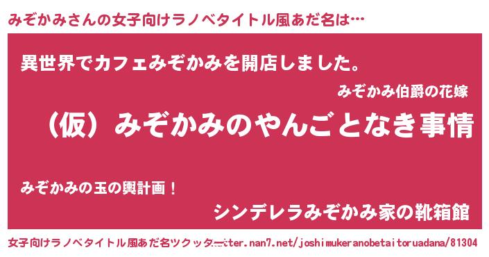 | 男性向けラノベタイトル風あだ名 | 『みぞかみの憂鬱』『緋弾のミゾカミ』 |