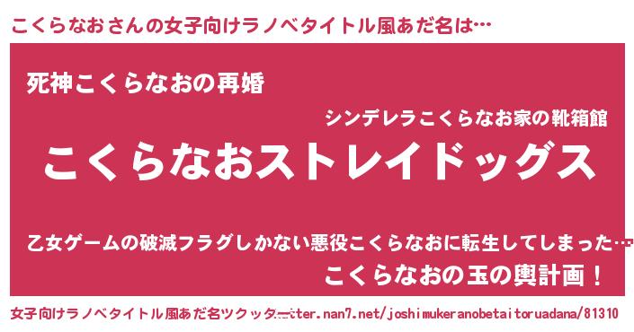 | 男性向けラノベタイトル風あだ名 | 『Re:こくらなおから始める異世界生活』 |