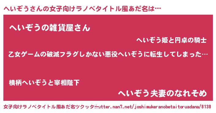 | 男性向けラノベタイトル風あだ名 | 『魔弾の王とへいぞう』 |