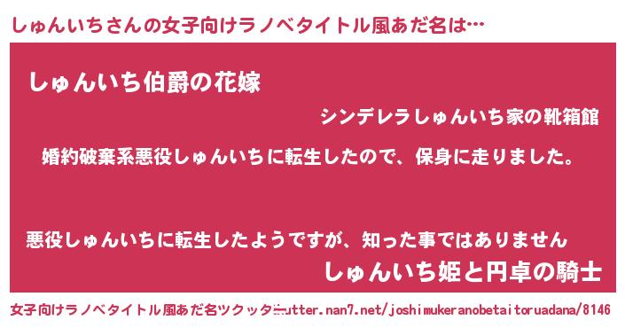 | 男性向けラノベタイトル風あだ名 | 『転生したらしゅんいちだった件』 |