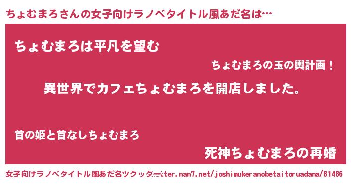 | 男性向けラノベタイトル風あだ名 | 『誰もが恐れるあのちょむまろが、ぼくの専属メイドになるようです。』 |