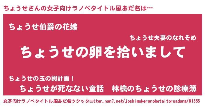 | 男性向けラノベタイトル風あだ名 | 『ちょうせの嫁は女の子じゃないと思った?』 |