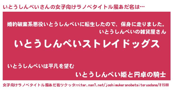 | 男性向けラノベタイトル風あだ名 | 『Re:いとうしんぺいから始める異世界生活』 |