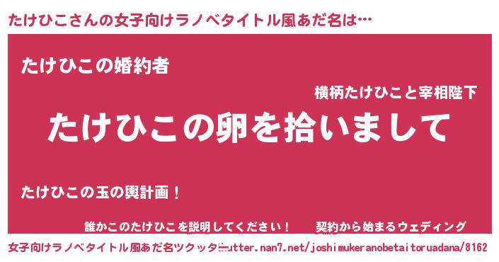 | 男性向けラノベタイトル風あだ名 | 『たけひこの嫁は女の子じゃないと思った?』 |