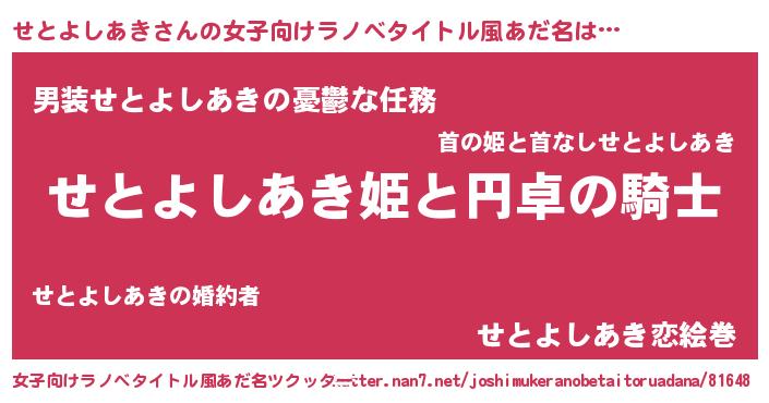 | 男性向けラノベタイトル風あだ名 | 『せとよしあきの憂鬱』 |