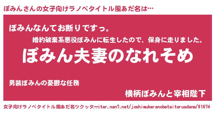 | 男性向けラノベタイトル風あだ名 | 『おまえをオタクにしてやるから、俺をぼみんにしてくれ! 』 |