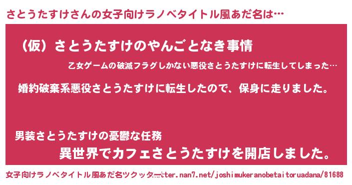 | 男性向けラノベタイトル風あだ名 | 『サトウタスケスレイヤー』 |