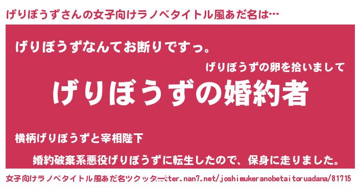 | 男性向けラノベタイトル風あだ名 | 『うちの娘の為ならば、俺はもしかしたらげりぼうずも倒せるかもしれない。』 |