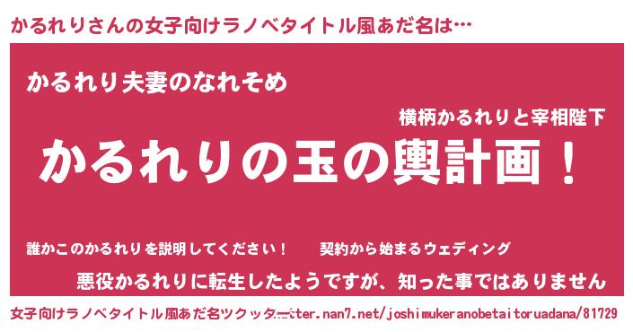 | 男性向けラノベタイトル風あだ名 | 『かるれり~年齢イコール彼女いない歴の魔法使い~』 |
