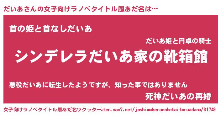 | 男性向けラノベタイトル風あだ名 | 『緋弾のダイア』『はたらくだいあさま!』 |