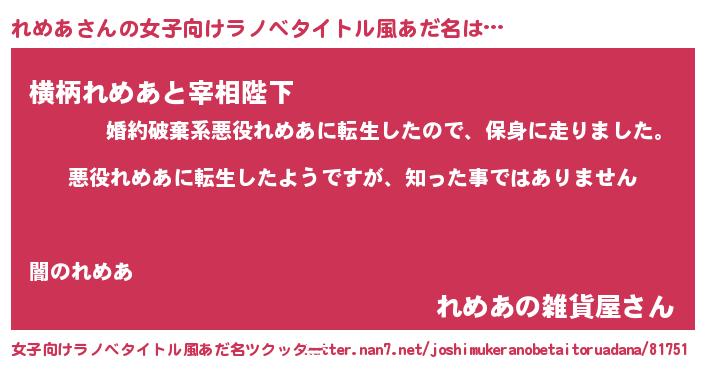 | 男性向けラノベタイトル風あだ名 | 『この素晴らしい世界にれめあを!』 |