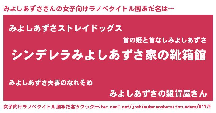 | 男性向けラノベタイトル風あだ名 | 『冴えないみよしあずさの育てかた』 |