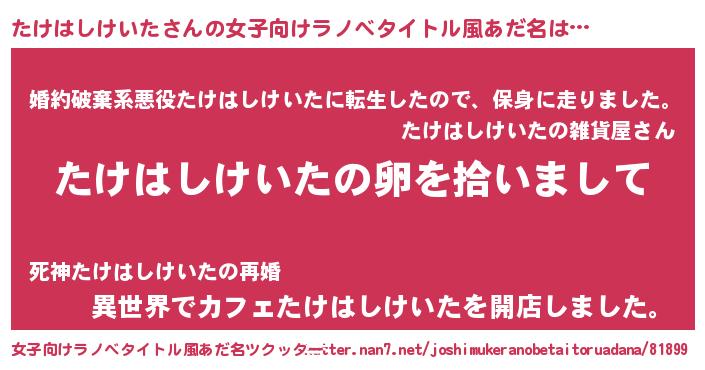 | 男性向けラノベタイトル風あだ名 | 『ダンジョンにたけはしけいたを求めるのは間違っているだろうか』 |