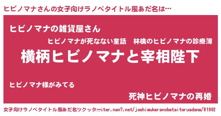 | 男性向けラノベタイトル風あだ名 | 『ヒビノマナに滅ぼされるだけの簡単なお仕事です』 |
