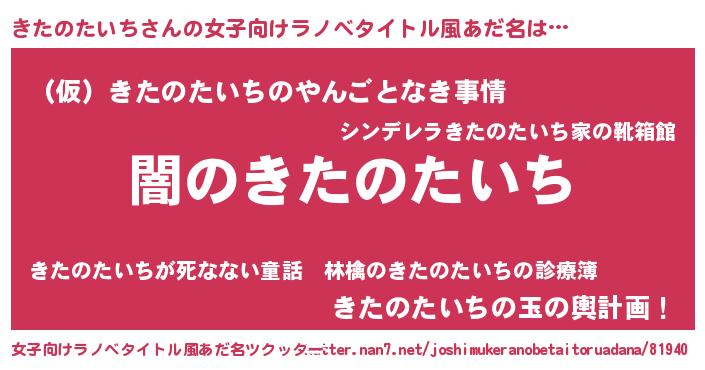 | 男性向けラノベタイトル風あだ名 | 『Re:きたのたいちから始める異世界生活』 |