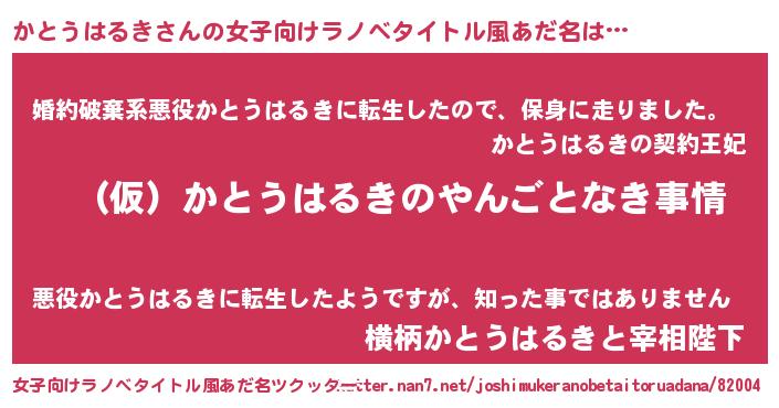 かとうはるきさんの女子向けラノベタイトル風あだ名は… 『(仮)かとうはるきのやんごとなき事情』『婚約破棄系悪役かとうはるきに転生したので、保身に走りました。』『横柄かとうはるきと宰相陛下』 ツクッター #女子向けラノベタイトル風あだ名ツクッター http://tkutter.nan7.net/joshimukeranobetaitoruadana/82004/