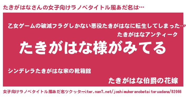 | 男性向けラノベタイトル風あだ名 | 『たきがはなの嫁は女の子じゃないと思った?』 |