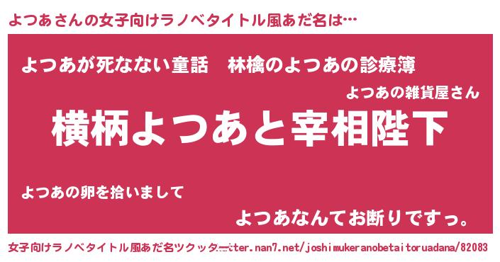 | 男性向けラノベタイトル風あだ名 | 『よつあに滅ぼされるだけの簡単なお仕事です』 |