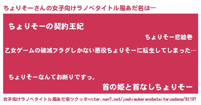 | 男性向けラノベタイトル風あだ名 | 『魔弾の王とちょりそー』 |