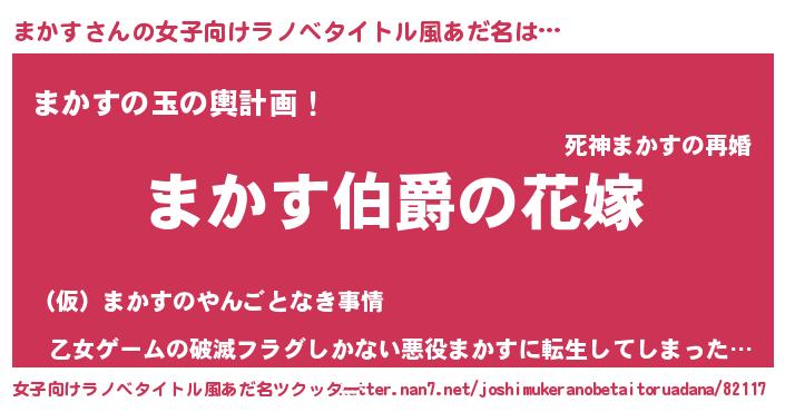 まかすさんの女子向けラノベタイトル風あだ名は… 『まかす伯爵の花嫁』『まかすの玉の輿計画!』『乙女ゲームの破滅フラグしかない悪役まかすに転生してしまった…』 ツクッター #女子向けラノベタイトル風あだ名ツクッター http://tkutter.nan7.net/joshimukeranobetaitoruadana/82117/