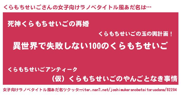 くらもちせいごさんの女子向けラノベタイトル風あだ名は… 『異世界で失敗しない100のくらもちせいご』『死神くらもちせいごの再婚』『(仮)くらもちせいごのやんごとなき事情』 ツクッター #女子向けラノベタイトル風あだ名ツクッター http://tkutter.nan7.net/joshimukeranobetaitoruadana/82204/