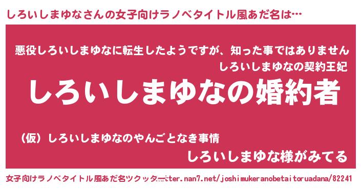 | 男性向けラノベタイトル風あだ名 | 『うちの娘の為ならば、俺はもしかしたらしろいしまゆなも倒せるかもしれない。』 |