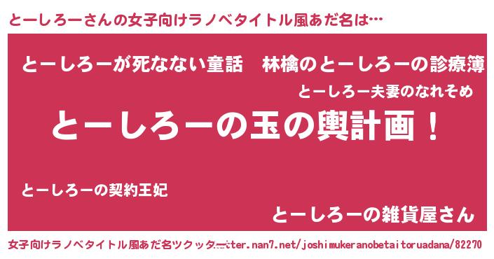 | 男性向けラノベタイトル風あだ名 | 『とーしろー~年齢イコール彼女いない歴の魔法使い~』 |