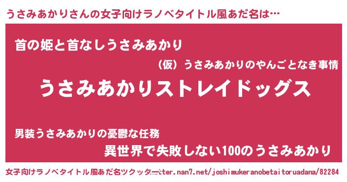 | 男性向けラノベタイトル風あだ名 | 『Re:うさみあかりから始める異世界生活』 |