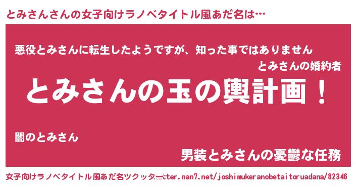 とみさんさんの女子向けラノベタイトル風あだ名は… 『とみさんの玉の輿計画!』『悪役とみさんに転生したようですが、知った事ではありません』『男装とみさんの憂鬱な任務』 ツクッター #女子向けラノベタイトル風あだ名ツクッター http://tkutter.nan7.net/joshimukeranobetaitoruadana/82346/