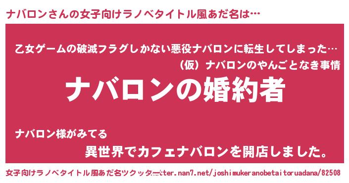ナバロンさんの女子向けラノベタイトル風あだ名は… 『ナバロンの婚約者』『乙女ゲームの破滅フラグしかない悪役ナバロンに転生してしまった…』『異世界でカフェナバロンを開店しました。』 ツクッター #女子向けラノベタイトル風あだ名ツクッター http://tkutter.nan7.net/joshimukeranobetaitoruadana/82508/