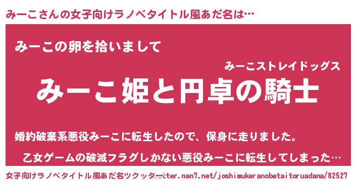 | 男性向けラノベタイトル風あだ名 | 『みーこの憂鬱』『魔弾の王とみーこ』 |