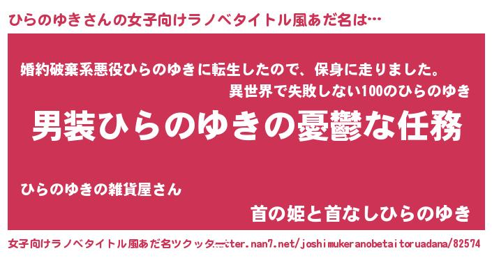 | 男性向けラノベタイトル風あだ名 | 『うちのひらのゆきが世界を掌握している!』 |