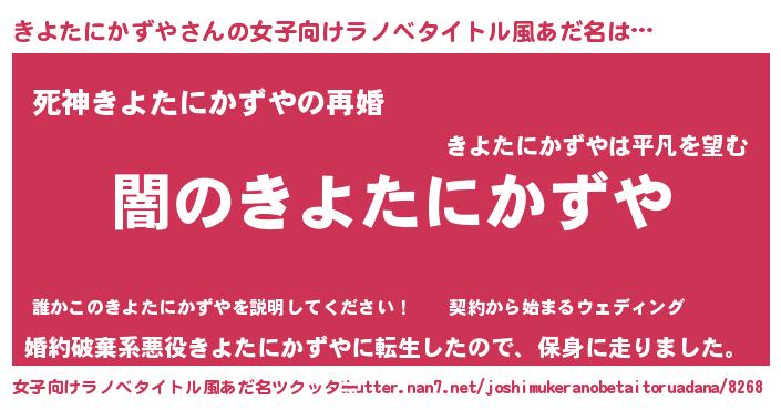 | 男性向けラノベタイトル風あだ名 | 『Re:きよたにかずやから始める異世界生活』 |